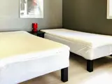 Es gibt auch einen Essbereich für vier Personen, wo Sie Ihre Mahlzeiten genießen können. Auf derselben Etage befinden sich zwei Einzelbetten, jedes 90 cm breit, und ein helles Badezimmer mit Dusche, WC und Waschbecken.