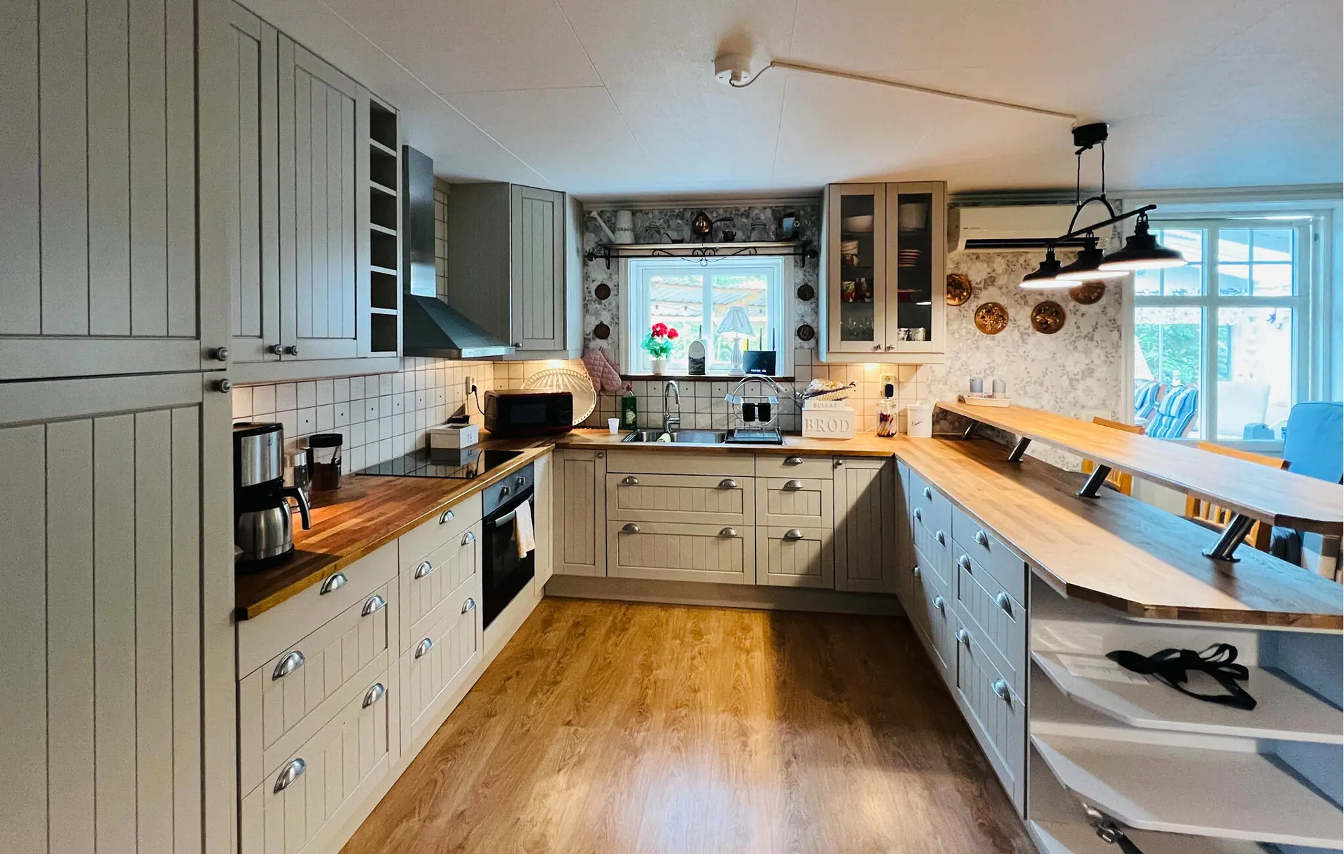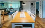 Dieses schöne Ferienhaus liegt umgeben von viel Wald und nur einen kurzen Spaziergang vom Fjord entfernt. Zaubern Sie in großer Runde leckere Gerichte in der geräumigen Küche, genießen Sie Ihre Mahlzeiten am behaglich beleuchteten Esstisch oder im überdachten Außenwohnbereich mit Blick ins Grüne. Legen Sie die Füße auf dem Lesesessel hoch oder veranstalten Sie behagliche Spieleabende auf dem einladenden Sofa.