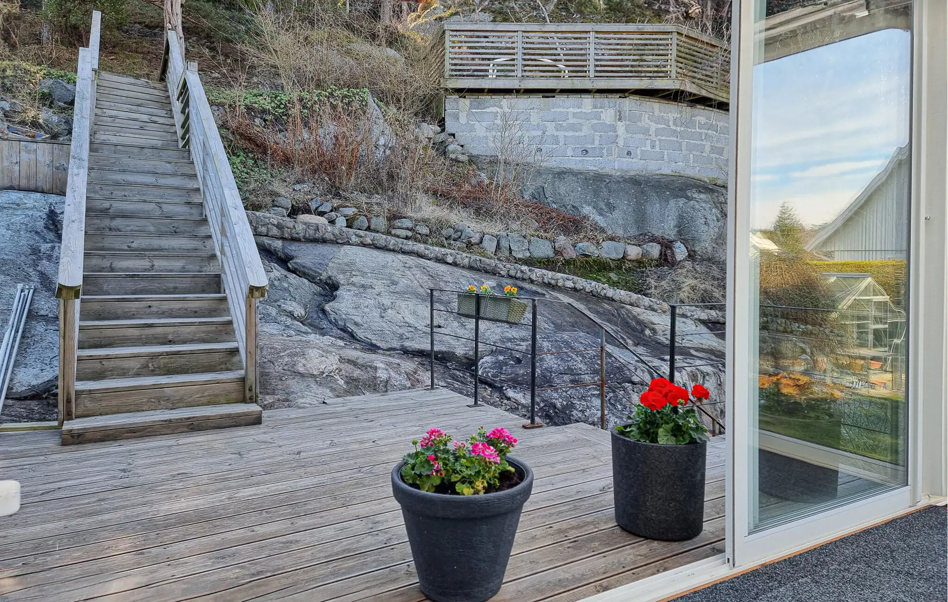 Im Außenbereich erwarten Sie mehrere Terrassen auf verschiedenen Ebenen, eingebettet in eine natürliche Felslandschaft. Hier finden Sie sonnige und geschützte Plätze zum Entspannen, Essen oder einfach zum Genießen der Ruhe im Grünen.