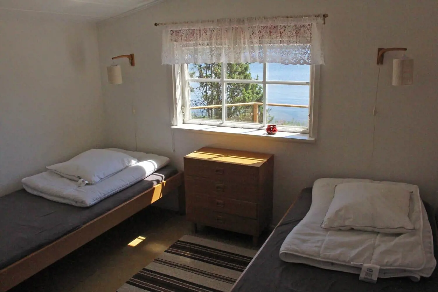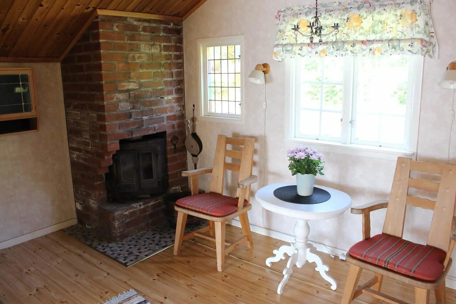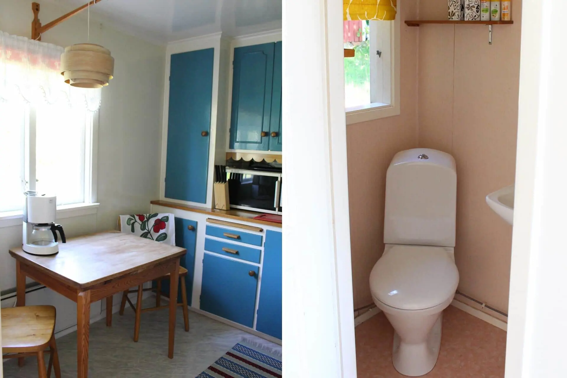 Das Haupt- und Gästehaus stammen aus den 1930er-Jahren und versprühen klassischen schwedischen Sommerhaus-Charme. Die Wohnfläche verteilt sich auf etwa 50 m² im Haupthaus und ca. 15 m² im Gästehäuschen. Das Wohnzimmer ist mit einem Kaminofen, gemütlicher Sitzecke und TV ausgestattet, das angrenzende Esszimmer bietet einen wunderbaren Blick auf den See. Im Wintergarten – einer verglasten Veranda – kannst du windgeschützt in die Natur blicken. Die Küche ist funktional ausgestattet mit E-Herd, Backofen, Kühlschrank mit Gefrierfach, Mikrowelle, Kaffeemaschine und Toaster, sowie einem kleinen Esstisch. Das Schlafzimmer im Haupthaus bietet zwei Einzelbetten, das separate Gästehaus beherbergt ein Doppelbett und ein Einzelbett – ideal für einen gemeinsamen Urlaub mit eigenem Rückzugsort. Das einfache Badezimmer mit Dusche erreichst du von draußen über einen separaten Eingang. Das WC grenzt an das Schlafzimmer im Haupthaus.
