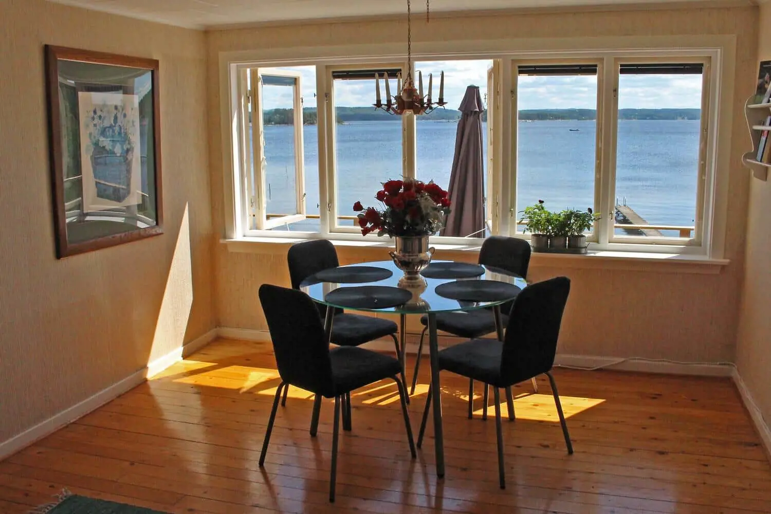 Vor dem Haus lädt eine große Veranda mit Seeblick zum Frühstück oder Abendstimmung genießen ein. Gartenmöbel, Grill sowie ein eigenes Ruderboot und Kanu stehen dir zur Verfügung – für entspannte Touren auf dem Mjörn. Zwei Fahrräder für Erwachsene und ggf. zwei Kinderfahrräder können auf Anfrage vor Ort bereitgestellt werden. Der Parkplatz befindet sich direkt am Haus.