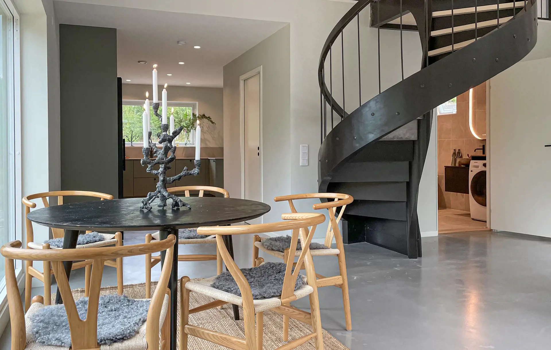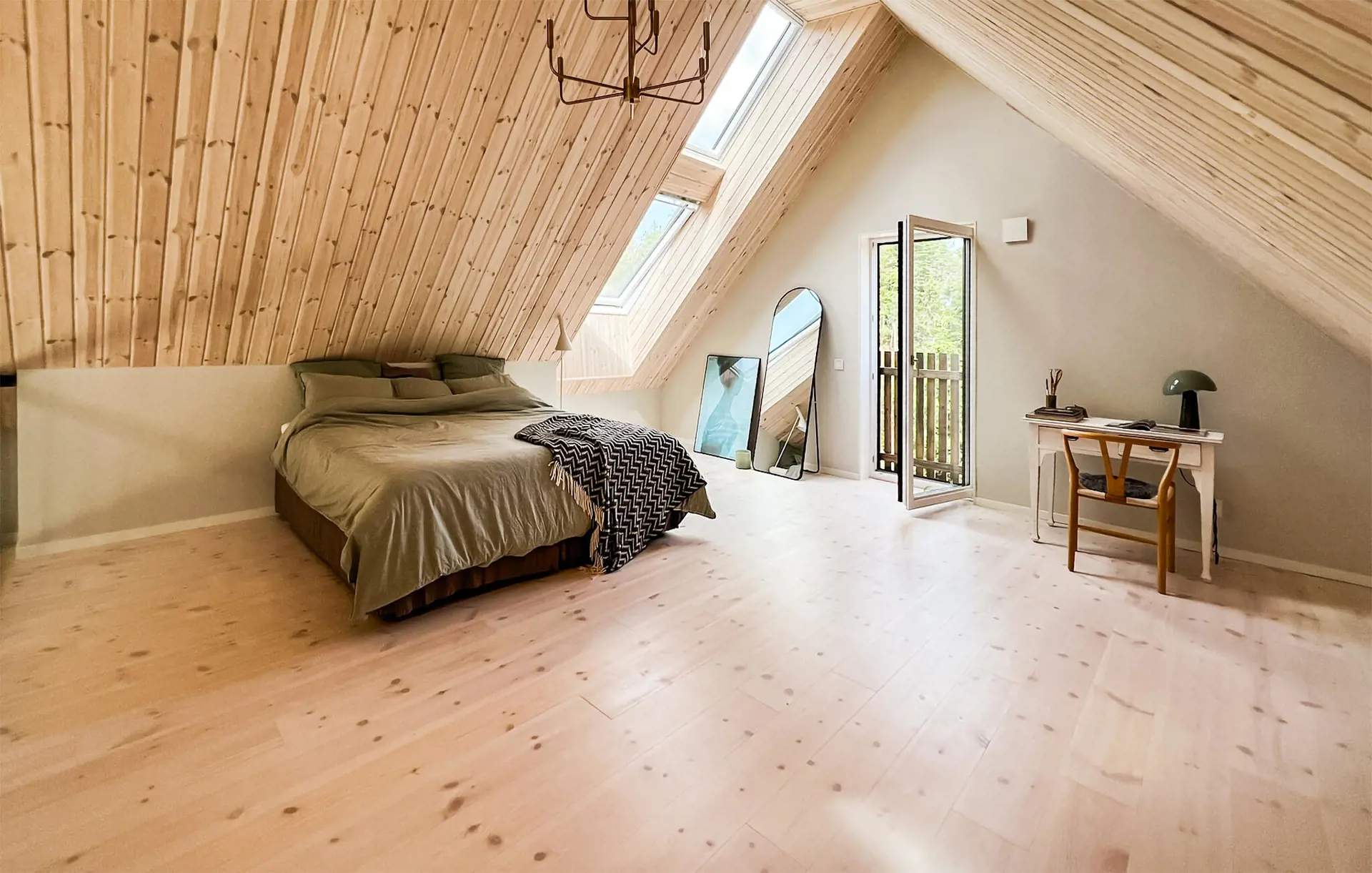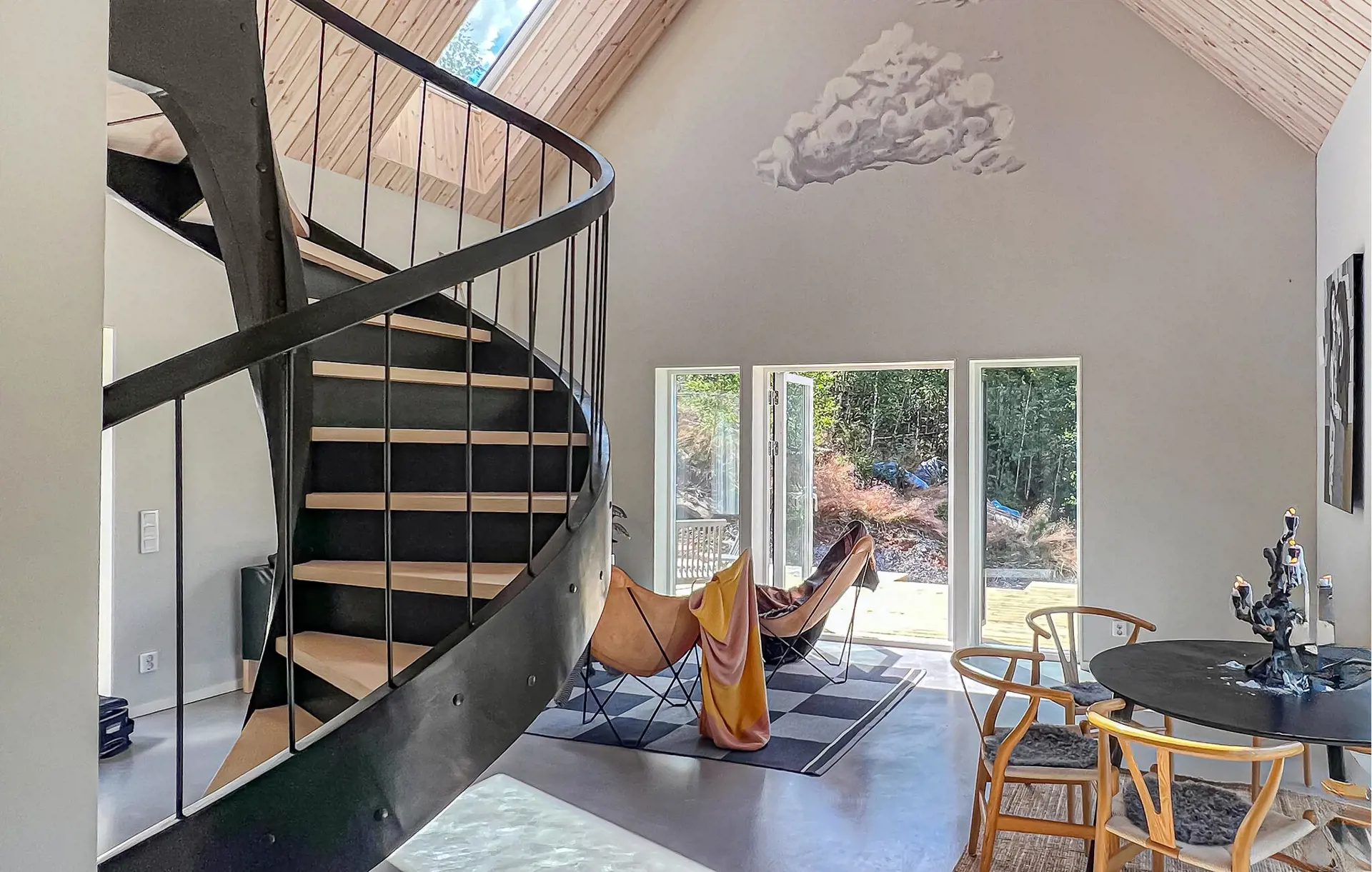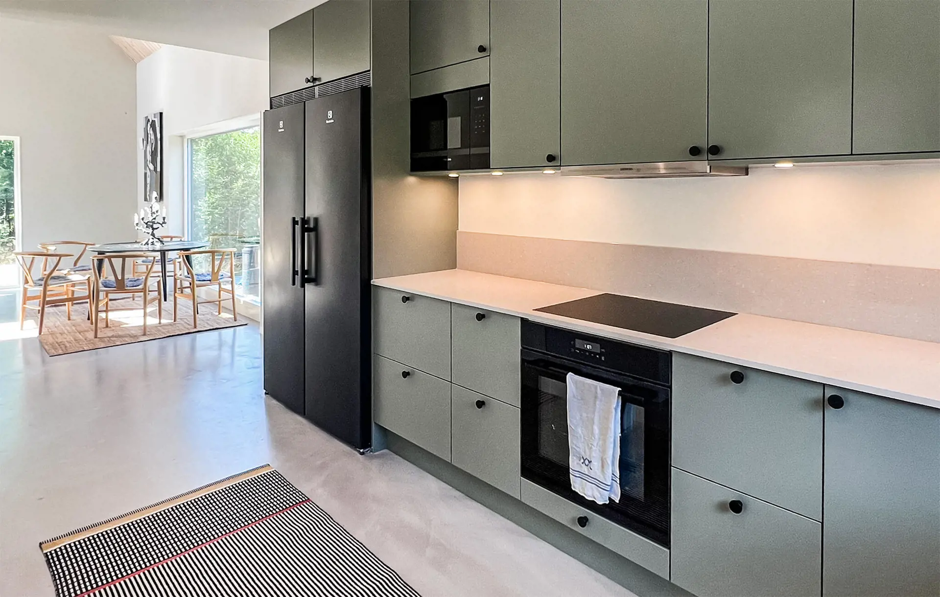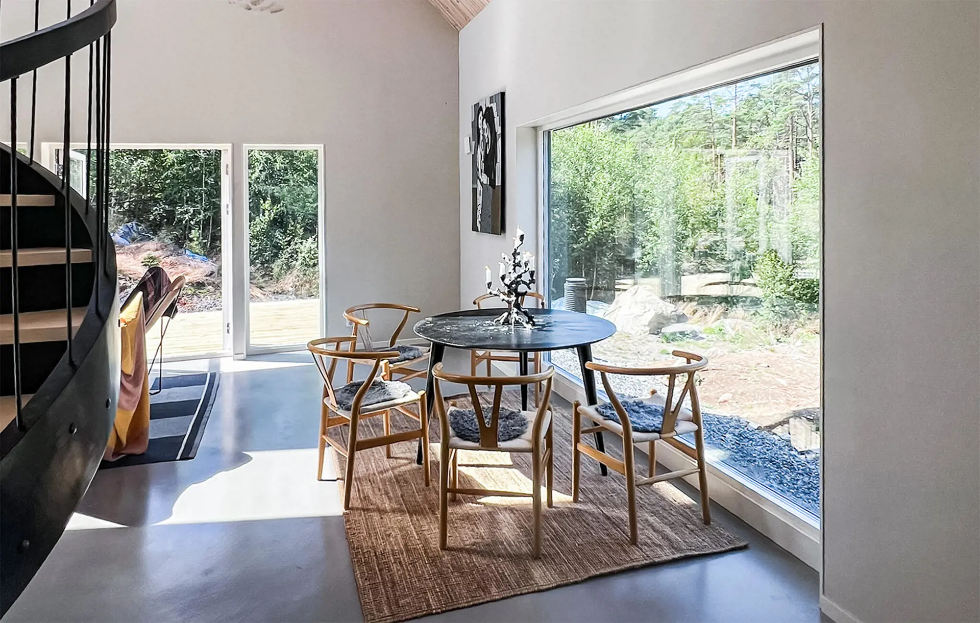 In diesem mit Holz verkleideten Haus vereinen sich Komfort und Behaglichkeit auf eine sehr harmonische Weise. Bodentiefe Fenster lassen viel Tageslicht ins Innere, warmes Holz und ein gemütliches Sofa laden zum Verweilen ein. Egal ob Sie Ihre Lieblingsmusik oder einen Podcast hören, lesen oder gemeinsam in der modernen Küche leckere Mahlzeiten zubereiten – hier gestalten Sie den Tag ganz in Ihrem Rhythmus.