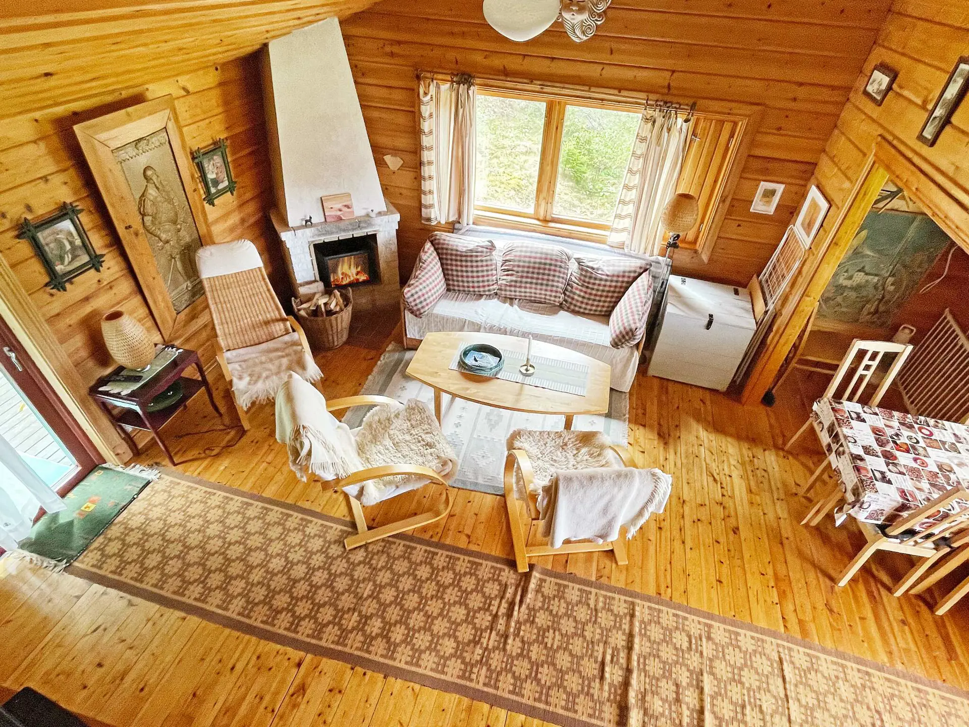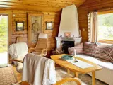 Im Wohnzimmer gibt es einen Kamin mit zwei bequemen Sesseln, einem Sofa und einem Fernseher. Als Ergänzung gibt es ein Schlafsofa mit 160 cm Breite.