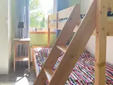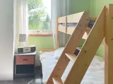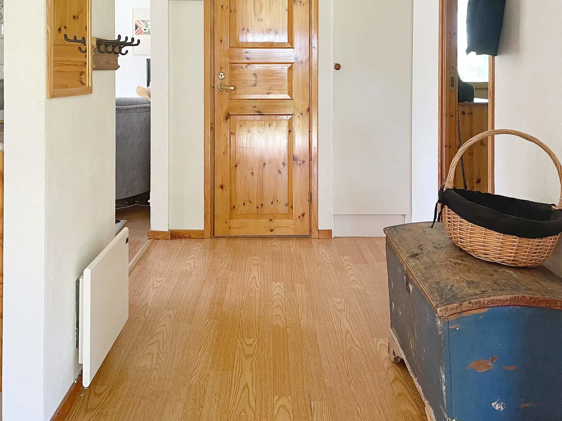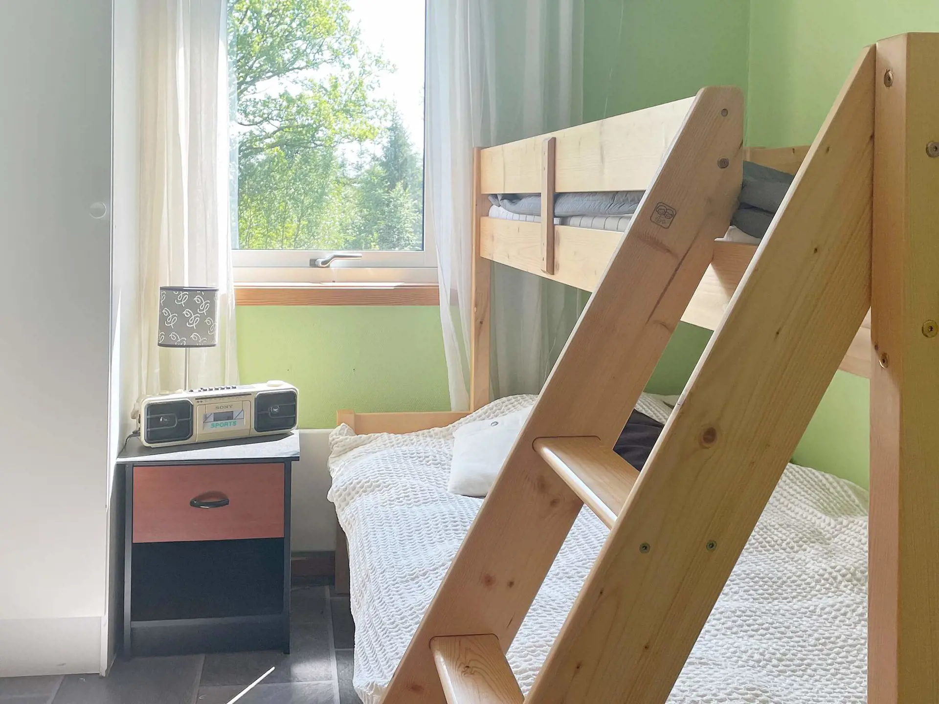 Vom Eingang auf der überdachten Veranda betreten Sie die Diele und werden von einer warmen Atmosphäre im gut isolierten Haus empfangen. Rechts davon befindet sich eine Toilette mit Dusche und Waschmaschine. Die Küche ist gut ausgestattet und verfügt über einen schönen Essbereich. Ein Schlafzimmer mit Doppelbett (180 cm breit) und Zugang zur zweiten Veranda. Zudem zwei kleinere Schlafzimmer im Haus mit jeweils einem Etagenbett (unten 120 cm / oben 80 cm breit). Das Wohnzimmer ist hell und einladend. Für gemütliche und etwas kühlere Abende gibt es hier einen Holzofen. TV und Chromecast (keine Internetverbindung verfügbar). Vom Essbereich und Wohnzimmer aus hat man einen schönen Blick in die Natur und von hier aus gelangt man auf den großen Balkon entlang der gesamten Längsseite des Hauses.\