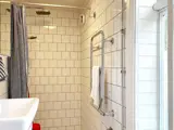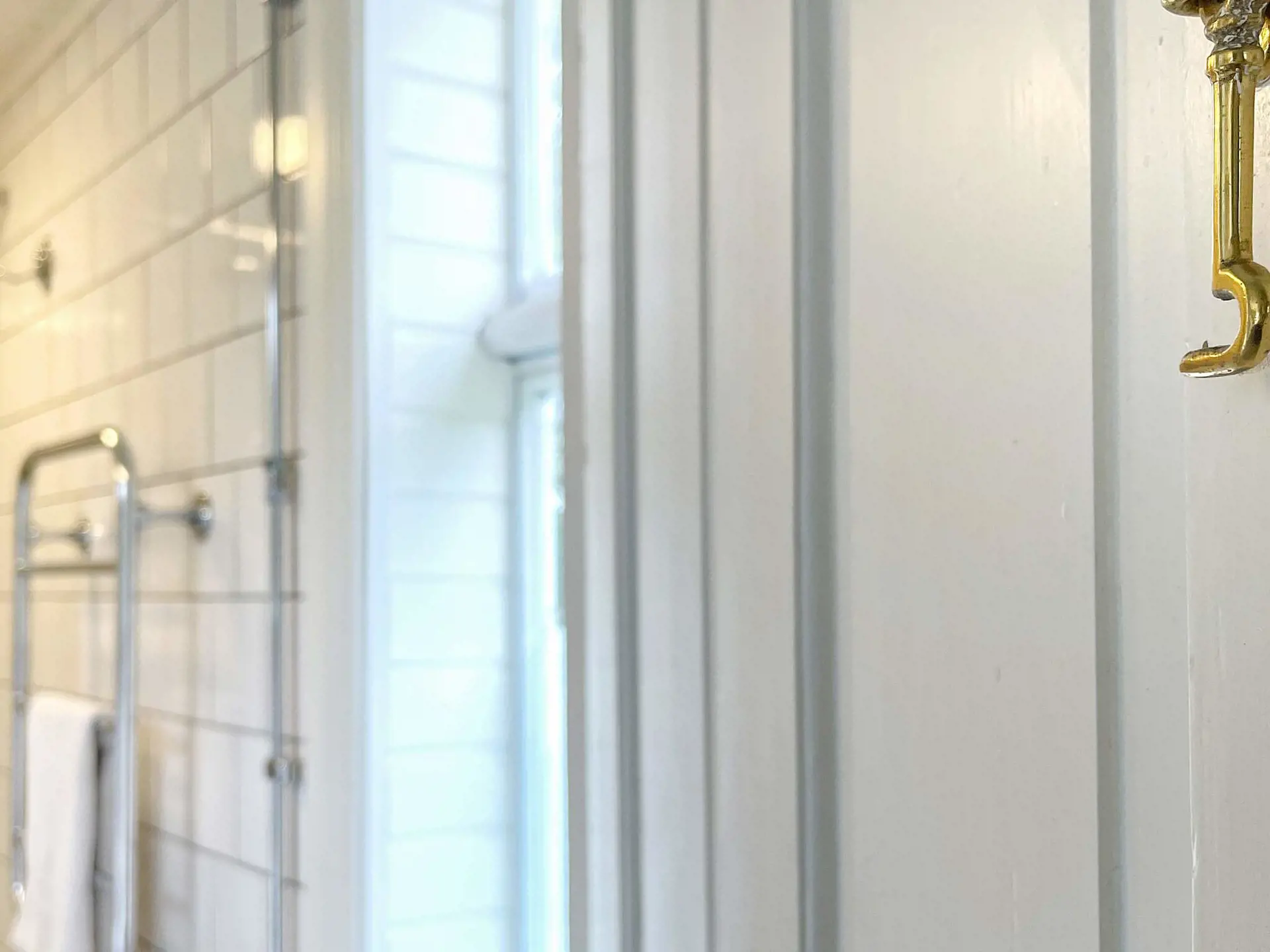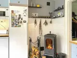 Der Eingang zum Haus befindet sich an der Rückseite. Sie betreten zuerst eine kleinere Diele. Geradeaus befindet sich das Badezimmer, das 2020 renoviert wurde. Es ist komplett gefliest mit Waschbecken/WC und Dusche. Auf der linken Seite befindet sich das Herzstück des Hauses; die Küche. Hier gibt es einen Essbereich für 4–6 Personen. Der Vorteil dieses Hauses besteht darin, dass es Türen und Durchgänge zu jedem Raum gibt, sodass das Haus geräumig wirkt. In zwei der Räume auf der unteren Ebene gibt es außerdem Kamine. Sehr charmant! Außerdem gibt es in der Küche einen neuen Kaminofen, der an kühleren Abenden gut wärmt. Brennholz kaufen Sie im nächstgelegenen Geschäft. Hinter einer Tür befindet sich auch eine Waschmaschine, ideal falls Sie mit kleineren Kindern reisen oder länger bleiben möchten.