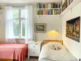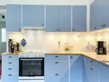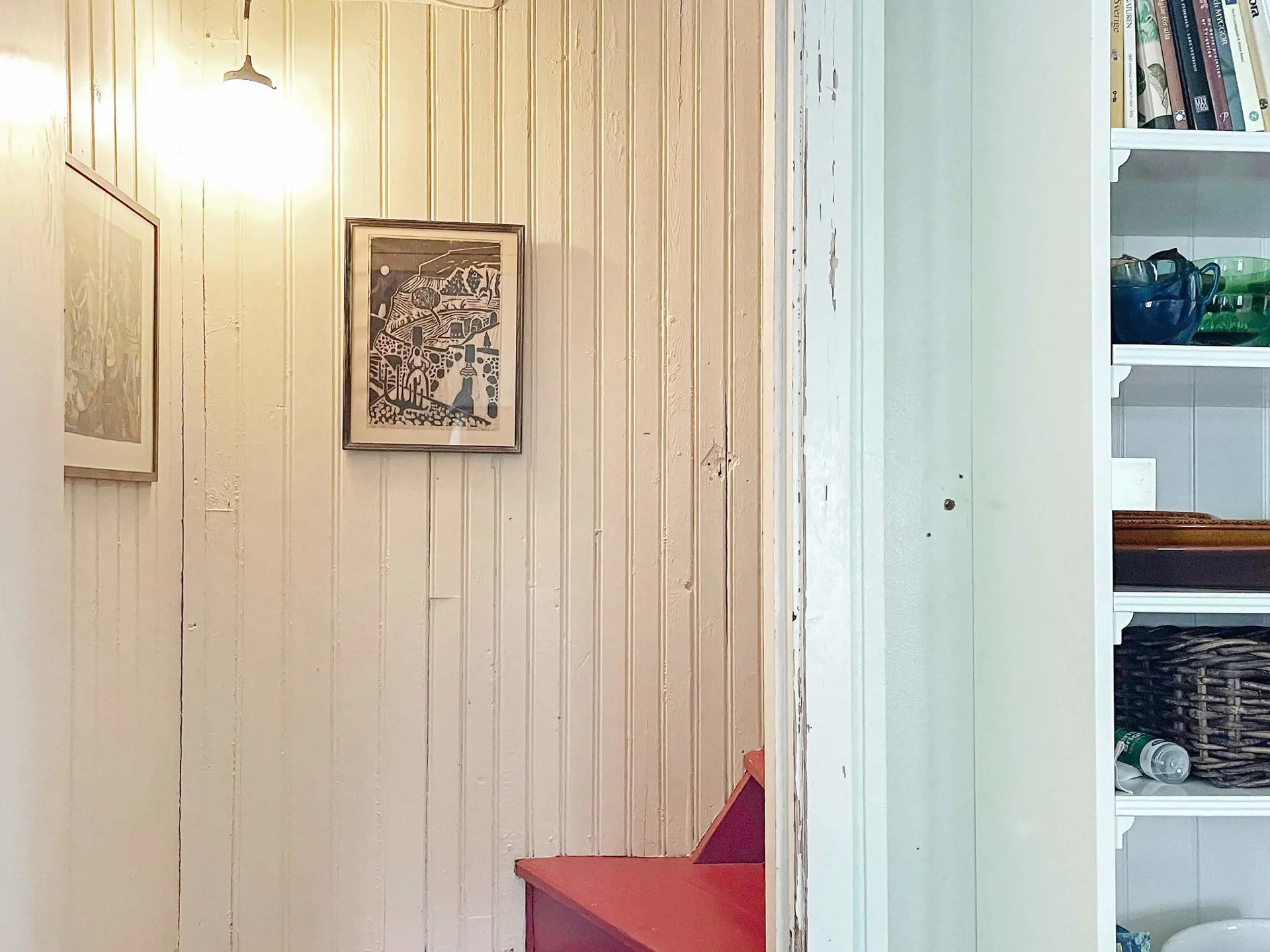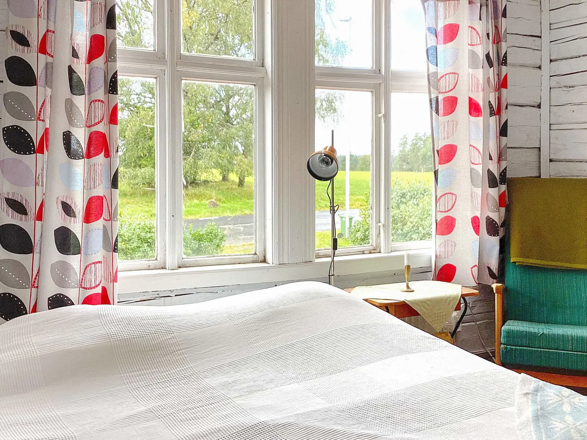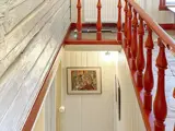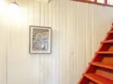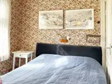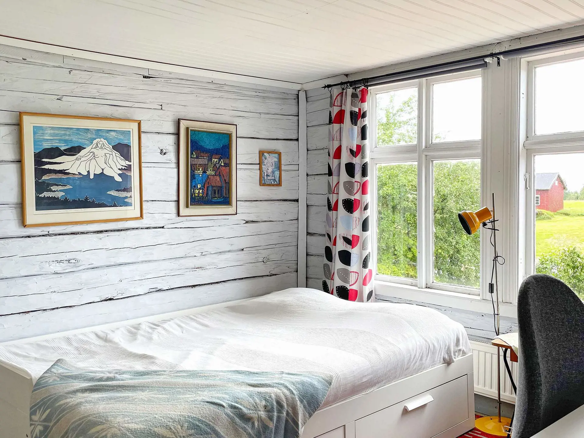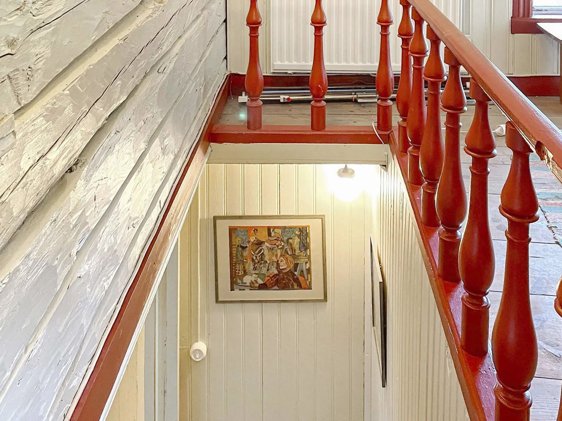 Die Treppe hinauf führt in die obere Etage des Hauses. Hier muss man aufpassen, dass man sich nicht den Kopf stößt und die Treppe ist etwas steil. Direkt rechts davon befindet sich das dritte Schlafzimmer des Hauses mit einem 160 cm breiten Bett. Es gibt auch einen Sessel und einen Schreibtisch. Die massiven Holzwände wurden in einem hellen Blauton gestrichen. Das Haus ist älter und vermittelt eine gemütliche Atmosphäre. Das Treppengeländer kann sich locker anfühlen, da es entfernt werden kann. Seien Sie ggf. beim Hoch- und Herunterheben von Möbeln vorsichtig. Die restlichen Räume auf der oberen Ebene dient der Lagerung und sind ausschließlich für den privaten Gebrauch bestimmt! Das Ferienhaus bietet somit Platz für eine größere Familie von 4–6 Personen.