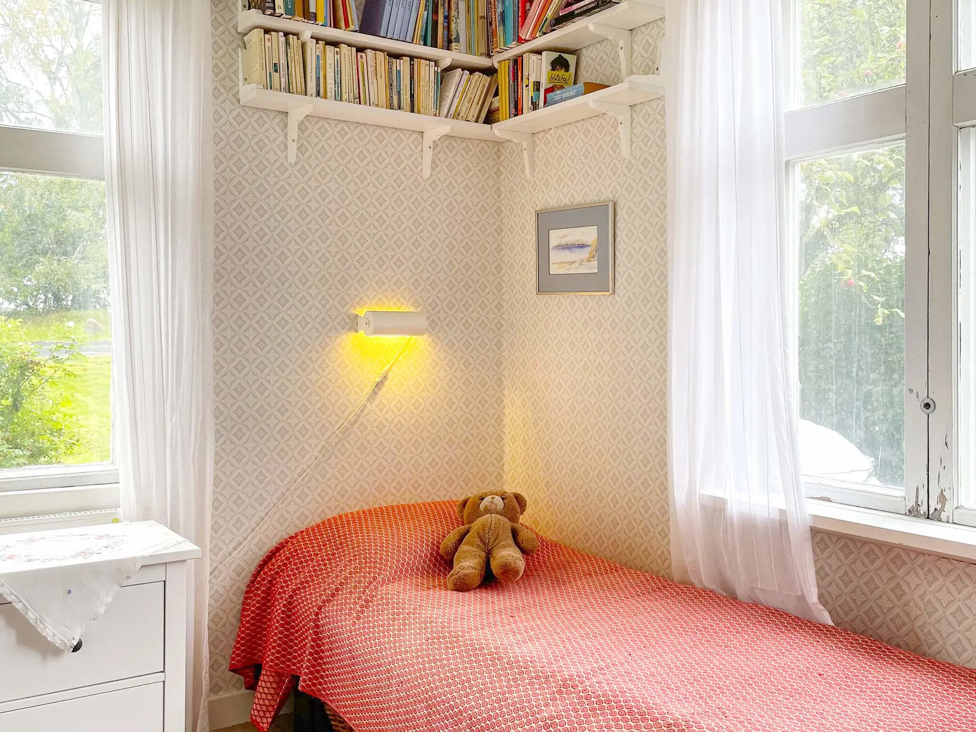 Direkt auf der linken Seite befindet sich das eine Schlafzimmer des Hauses mit einem Doppelbett (160 cm breit). Im gemütlichen Wohnzimmer gibt es ausreichend Sitzgelegenheiten für die ganze Familie sowie einen Holzofen. Auf der rechten Seite befindet sich das zweite Schlafzimmer des Hauses mit zwei je 90 cm breiten Einzelbetten. Hier steht auch ein Sessel, falls Sie lesen und sich zurückziehen möchten. Geradeaus befindet sich der alte Haupteingang, bei dem es sich nun um eine verglaste Veranda handelt. Hier ist es super gemütlich, man kann die Abendsonne noch lange genießen oder nach Einbruch der Dunkelheit Kerzen anzünden.